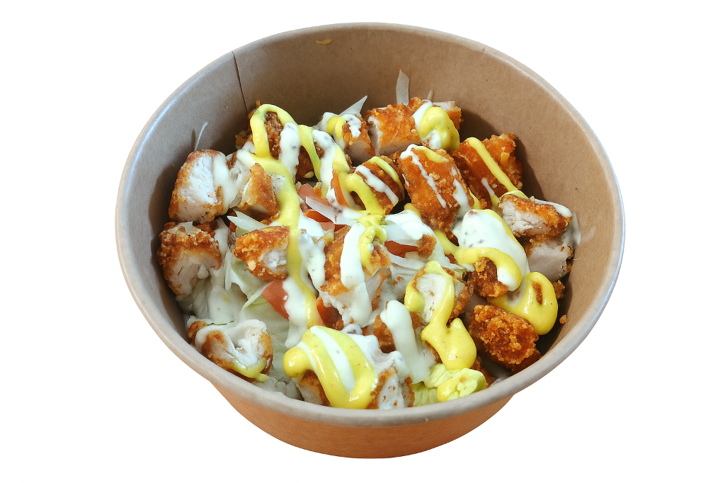 poulet mariné, crudités au choix, sauces au choix, frites et sauce fromagère maison